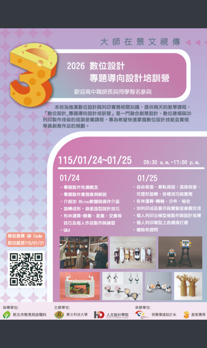 主旨:檢送「115年高中、高職等學校_3D數位設計_專題導向設計培訓營」實施計畫,敬請貴校推薦設計相關科系之二、三年級學生踴躍報名參加,並歡迎教師帶隊參與,請查照。